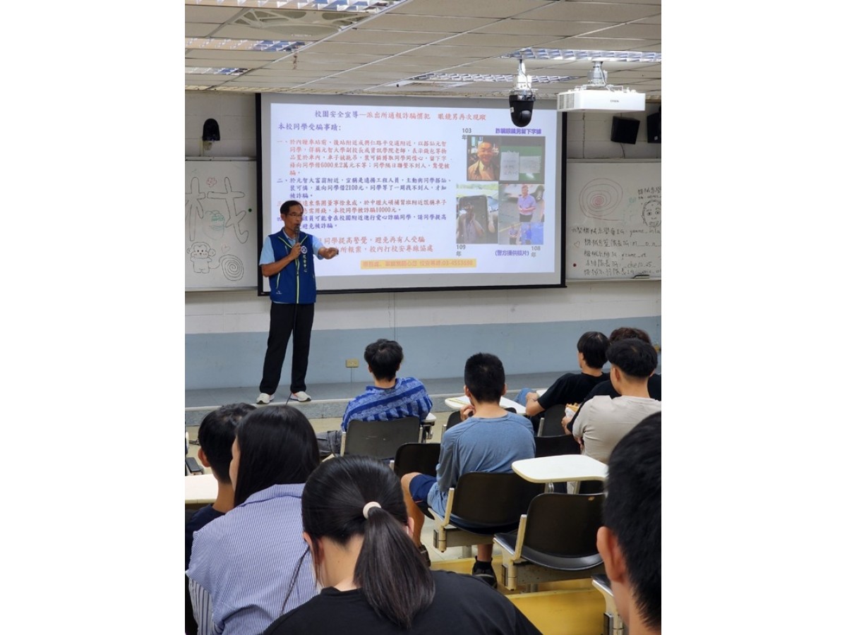 導師吳昌暉、沈家傑、鐘國濱老師簡單的向同學們在學業及生活上的叮嚀;温文和系教官提供必要的安全知識和緊急聯絡資訊;生輔組透過Q&A發放小禮品,活絡氣氛,也讓同學們不知不覺的記住重要事項。