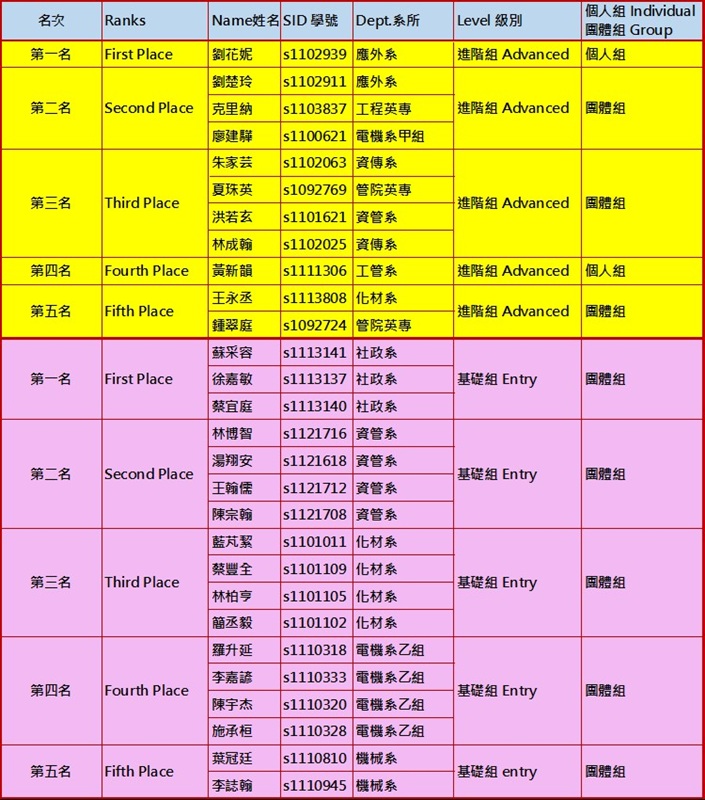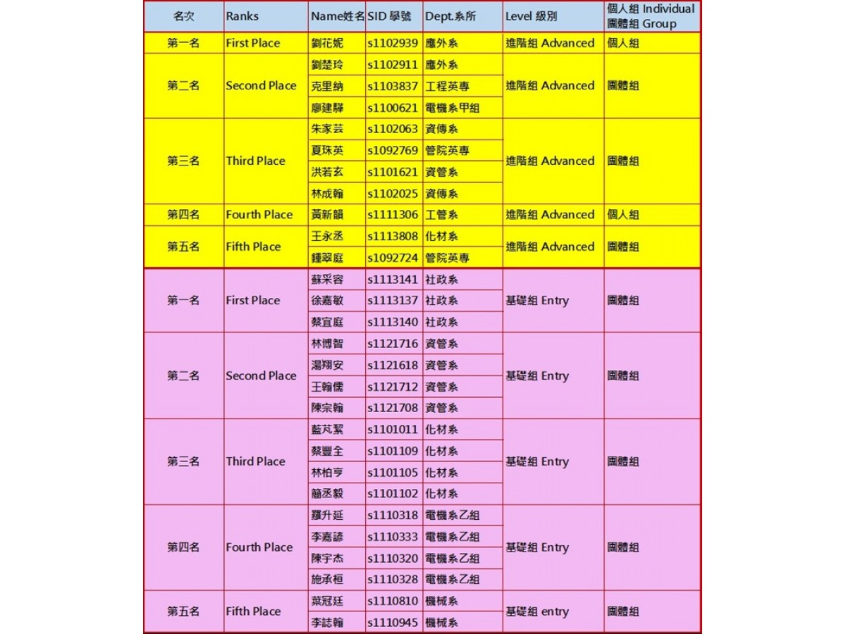 恭喜本系葉冠廷(S1110810)同學及李誌翰(S1110945)同學進入決賽並獲團體賽基礎組第5名。