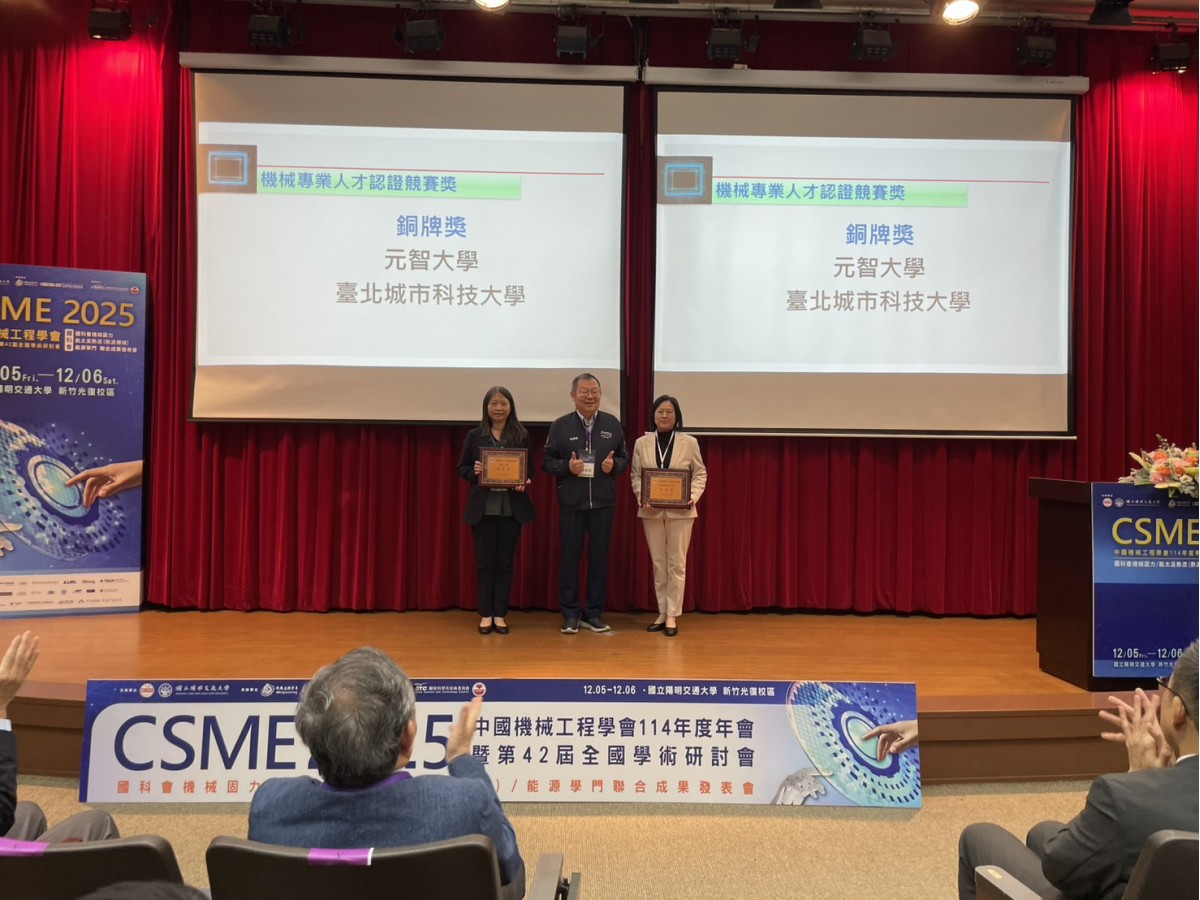 114本系參加中國機械工程師學會所主辦之機械人才認證初級,有28個同學參加。其中,7個同學通過認證,另外8個同學通過1科考試。成績斐然,榮獲機械專業人才認證競賽銅牌獎。本系江 主任代表領獎。