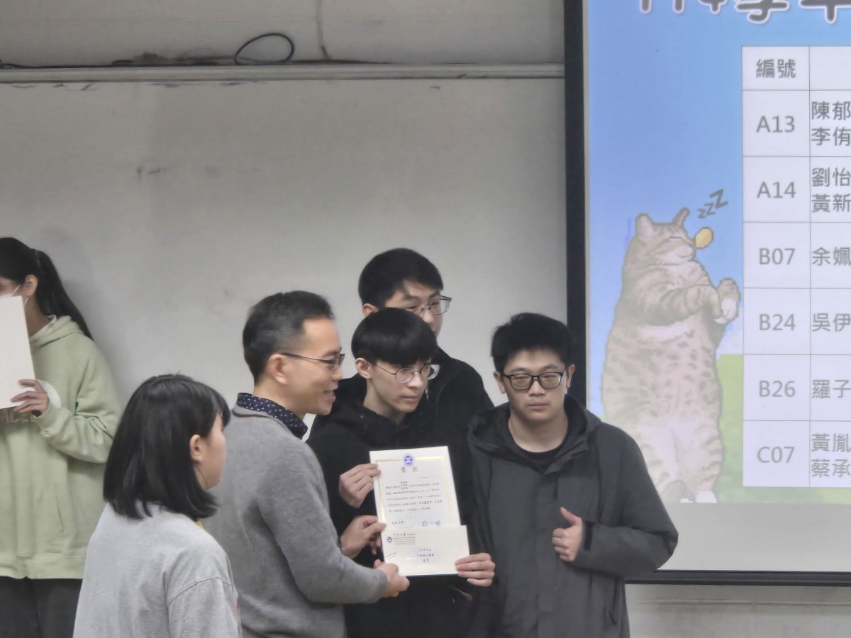 全部參賽共39組、本系有7組,得獎有特優_楊O蓁、簡O蓁,優等_黃O睿、呂O斌、蔡O彰,佳作_林O宸、葉O成,能在如此激烈的競爭中脫穎而出,代表得獎者不僅展現了堅實的研究能力,也展現了面對問題、勇於突破的精神。這份成果來自你們長時間的努力與投入,在此向各位致上最高的肯定與祝賀。