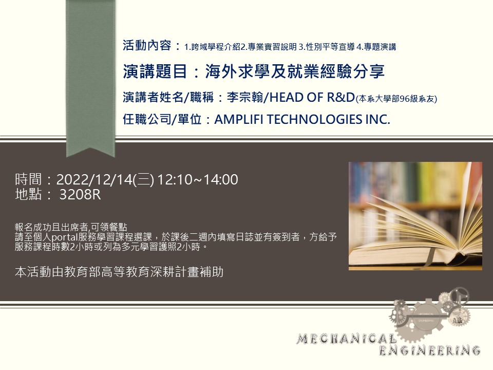 【演講公告】海外求學及就業經驗分享111.12.14(星期三)12:10於3208R