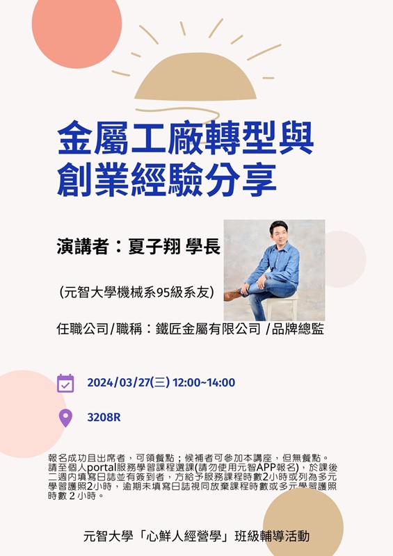 演講公告:金屬工廠轉型與創業經驗分享113.03.27(星期三)12:10~14:00於3208R