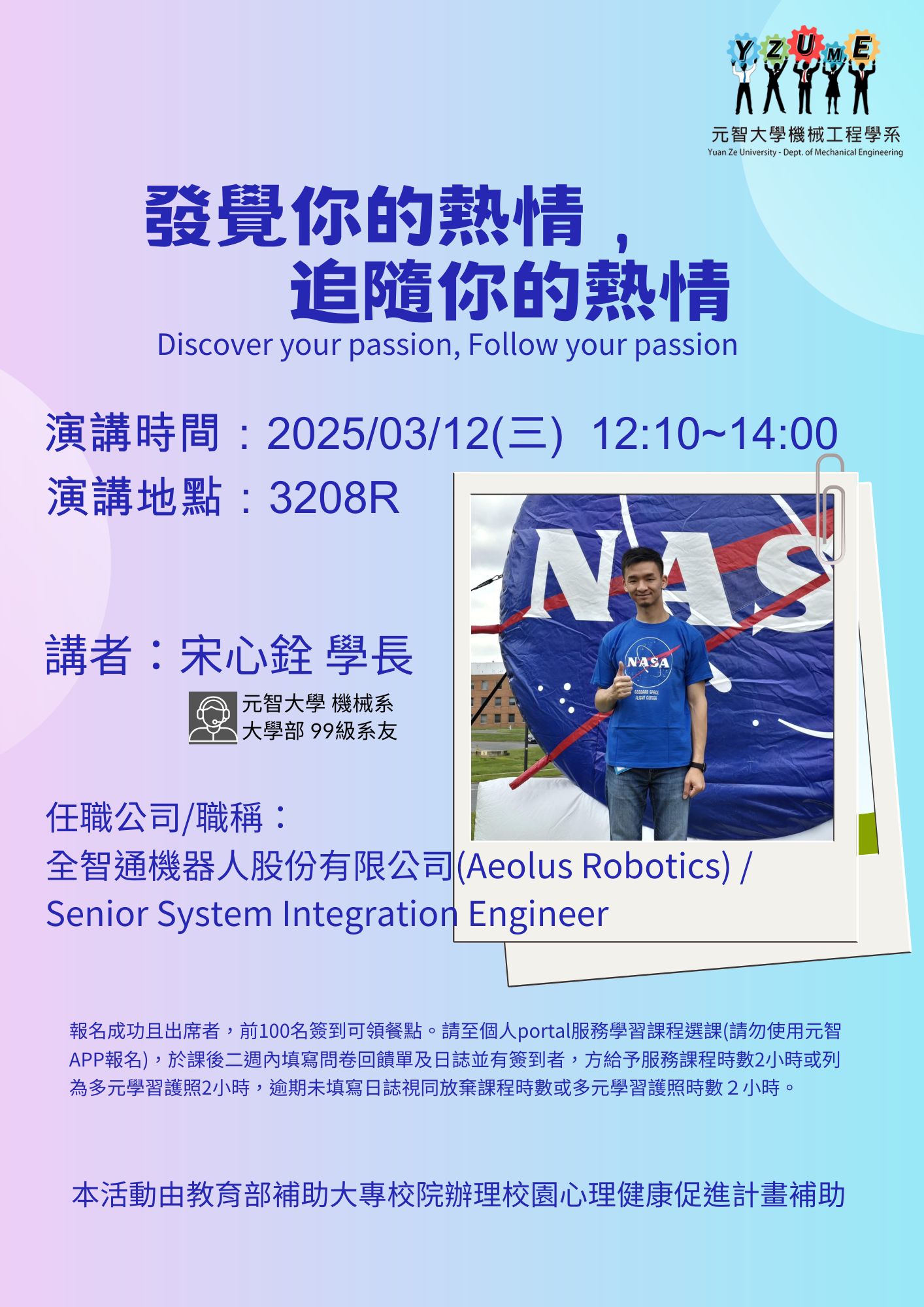 【演講公告】2025/03/12 (星期三) 12:10-14:00發覺你的熱情,追隨你的熱情