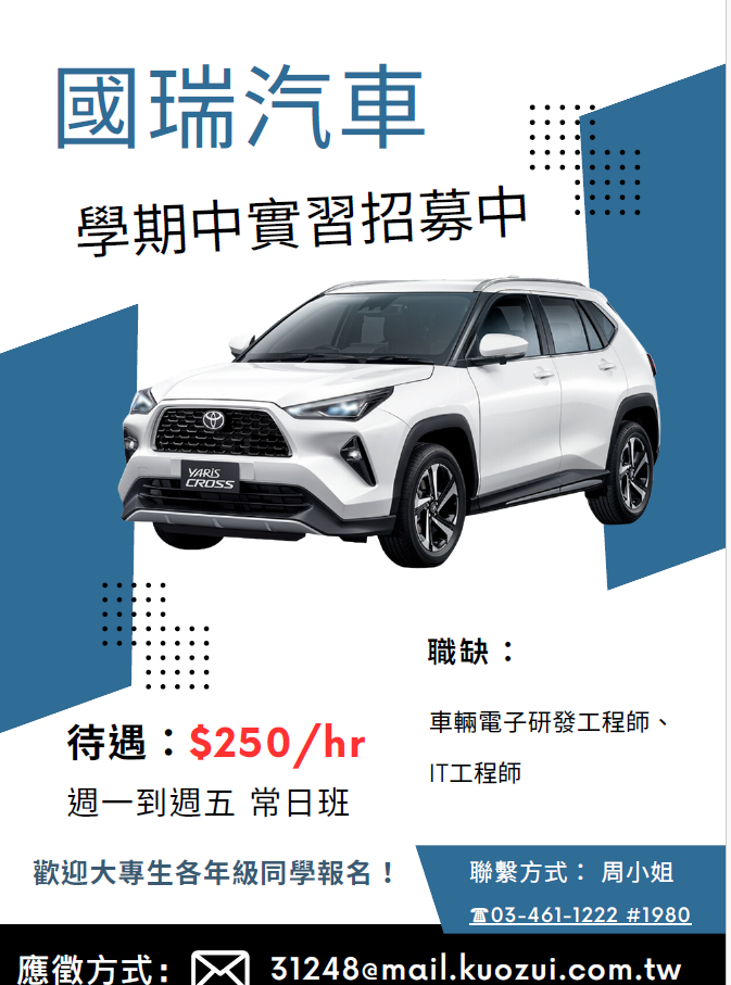 【企業實習合作】2025年度國瑞汽車學期中實習職缺